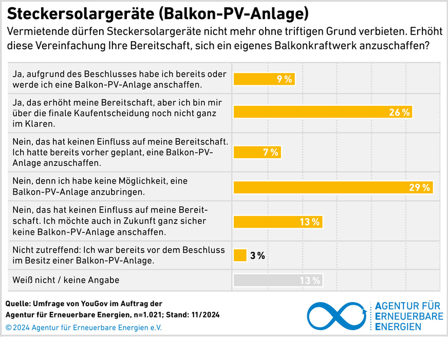 Nachdem die Bundesregierung die Anbringung von Steckersolargeräten vereinfacht hat, indem Vermieter:innen diese nicht mehr ohne triftigen Grund verbieten dürfen, wollten wir wissen, ob die Bürger:innen nun eher bereit sind, sich eine solche Balkon-Photovoltaikanlage zuzulegen. Neun Prozent gaben an, dass sie sich aufgrund des Beschlusses bereits eine solche Anlage angeschafft hätten. Bei 26 Prozent hat die Neuerung die Bereitschaft erhöht, eine endgültige Entscheidung sei aber noch nicht gefallen. Für sieben Prozent ist der Kauf bereits vorher geplant gewesen. 29 Prozent gaben an, in ihrer Wohnung leider keine Möglichkeit zu haben, ein Steckersolargerät anzubringen.
