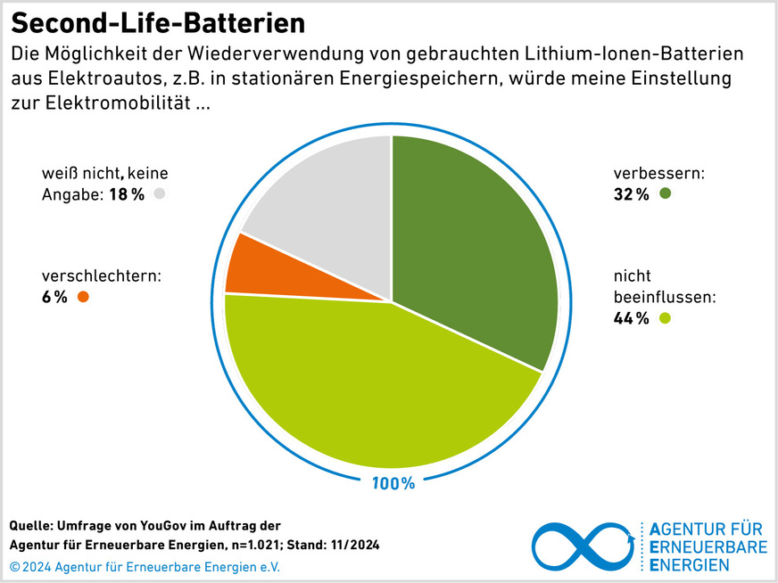 Ein sehr wichtiger Teil der Energiewende ist die Verkehrswende. Denn hier hat sich in den vergangenen Jahren in Sachen Reduktion der Treibhausgase wenig getan. Ein Schlüssel zum Erfolg ist die Elektromobilität. Doch vielen stellt sich hier die Frage: Wohin mit den gebrauchten Batterien? Die Weiterverwertung in stationären Batteriespeichern zur Speicherung von Solar- oder Windstrom kann eine Lösung sein. Deshalb stellten wir die Frage, inwiefern die Möglichkeit, Batterien wiederzuverwenden, die Einstellung der Befragten zur Elektromobilität beeinflussen würde. 44 Prozent gaben an, dies hätte keinen Einfluss. 32 Prozent würden die Elektromobilität positiver bewerten.