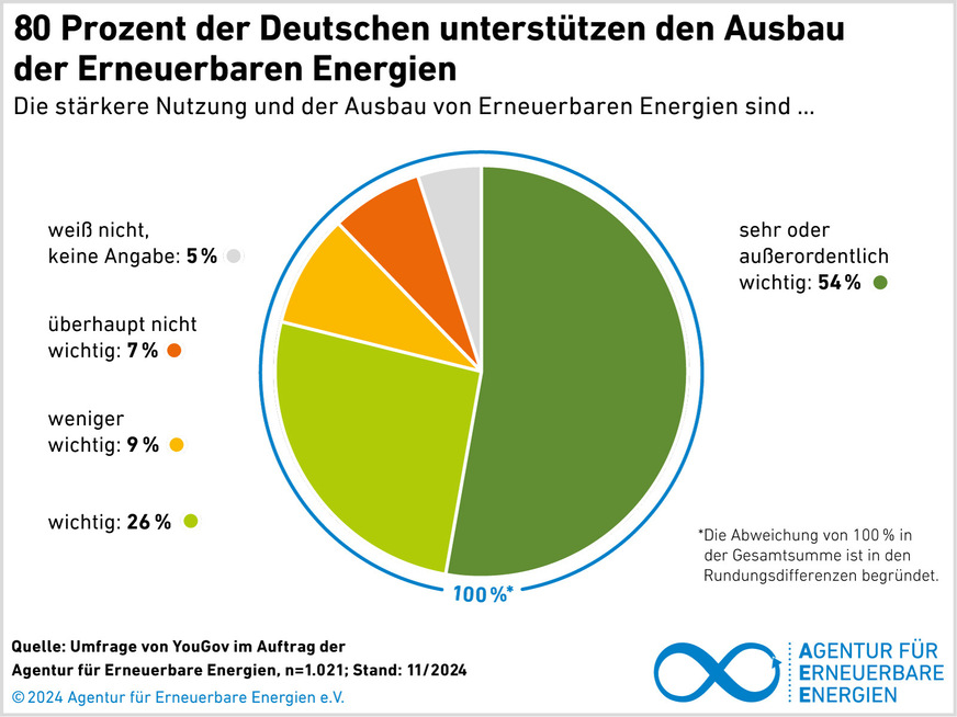 Die AEE-Akzeptanzumfrage ist eine deutschlandweite, bevölkerungsrepräsentative Umfrage von You Gov im Auftrag der Agentur für Erneuerbare Energien. Befragt wurden online 1021 Personen ab einem Alter von 16 Jahren. Den Befragten war der Auftraggeber der Umfrage nicht bekannt.