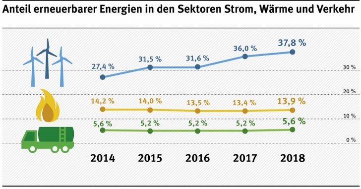 Der Anteil der erneuerbaren Energien am Bruttoendenergieverbrauch für Strom, Wärme und Verkehr insgesamt steigt von 15,5 % im Jahr 2017 auf vorläufig 16,6 % im Jahr 2018. Damit nähert sich Deutschland seinem verbindlichen Ziel von 18 % im Jahr 2020, welches sich aus der aktuellen EU-Erneuerbare-Energien-Richtlinie 2009/28/EG ergibt.