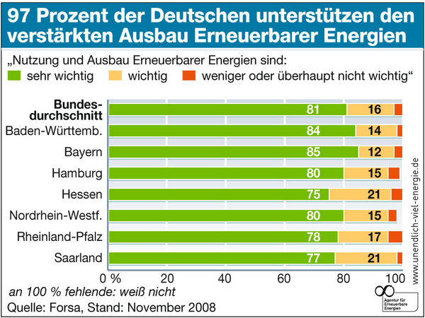 1) Befragt wurden durch das Meinungsforschungsinstitut forsa zwischen dem 17. und 28. November 2008 im Auftrag der Agentur für Erneuerbare Energien deutschlandweit 2958 Personen ab 14 Jahren zum Thema „Erneuerbare Energien“. Die Erhebung fand im Rahmen einer bevölkerungsrepräsentativen telefonischen Mehrthemenumfrage statt.