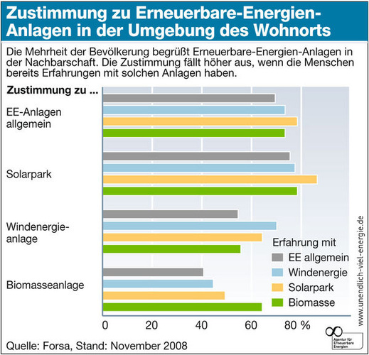 Die Bürger wünschen sich nicht nur prinzipiell und allgemein einen wachsenden Anteil erneuerbarer Energien an der Energieversorgung, sondern sie akzeptieren mehrheitlich auch die dafür notwendigen Anlagen im eigenen Wohnumfeld. Sie sehen also Vorteile gegenüber der herkömmlichen Stromerzeugung auf Basis von Kohle, Kernenergie und Erdgas. Die insgesamt hohe Akzeptanz von Anlagen zur Stromerzeugung aus Sonnenlicht, Wind und Biomasse ist bei denjenigen Menschen, die erneuerbare Energien bereits aus ihrem eigenen Wohnumfeld kennen, sogar überdurchschnittlich hoch.