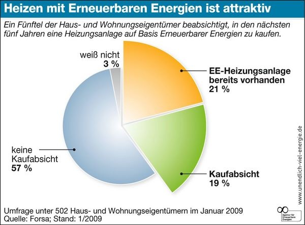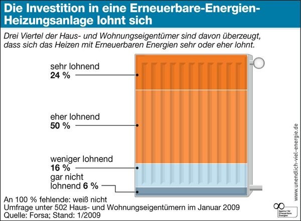 Vor dem Hintergrund der Finanzkrise sehen drei Viertel aller Haus- und Wohnungseigentümer im Umstieg auf Solarthermie-, Holzpellet- oder Erdwärmeheizungen eine lohnende Investition. Auch der seit 1. Januar geltenden Nutzungspflicht erneuerbarer Wärme in Neubauten steht mit 78% eine große Mehrheit der Befragten positiv gegenüber. Das ergab eine Blitzumfrage des Meinungsforschungsinstituts Forsa in der zweiten Januarwoche 2009 unter 502 Haus- und Wohnungseigentümer im Auftrag der