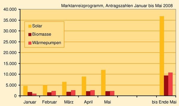 Die Zurückhaltung der ersten drei Monaten bei den Antragszahlen für Förderzuschüsse zu thermischen Solaranlagen ist gebrochen. Bis Ende Mai wurden 36.765 Anträge gestellt, knapp ein Drittel davon (11.932) allein im Mai. Mit einer linearen Fortschreibung auf dem Mai-Niveau würde man bis zum Jahresende auf insgesamt 120.000 Förderanträge kommen. Der bisher stärkste Flächenzubau aus dem Jahr 2006 würde damit deutlich übertroffen werden. Die Hersteller sind aktuell mit der Nachfrage ebenfalls sehr zufrieden, einige Anbieter haben sogar Lieferprobleme. Die Bundesverband Solarwirtschaft geht allerdings von deutlich geringerem Absatz aus. Der gerade bis Ende 2009 verlängerte Programmpunkt „Solar plus Brennwertkessel“ konnte bis Ende Mai 9690 Anträge einsammeln. 85% aller Solaranlagenanträge entfielen auf Flachkollektoren, 15% auf Röhrenkollektoren.