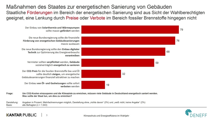 „Die Umfrage zeigt deutlich: Um die Bevölkerung wirklich zu überzeugen, ist ein beherzter Mix aus Fördern und Fordern nicht nur wichtig, sondern trifft auch auf hohe Akzeptanz in der Bevölkerung“, sagt Christian Noll, geschäftsführender Vorstand der Deutschen Unternehmensinitiative Energieeffizienz (DENEFF). Eine neue Bundesregierung habe jetzt die große Chance, mit verbindlichen Standards für die energetisch schlechtesten Gebäude den Sektor auf Zielpfad zu bringen, dabei die Konjunktur weiter anzukurbeln und viele Tausende nachhaltige Jobs zu schaffen. Der große Rückhalt in der Bevölkerung für energetische Mindeststandards sei zudem ein gutes Zeichen in Richtung EU-Kommission, die derzeit die europaweite Einführung solcher Standards vorbereitet.
