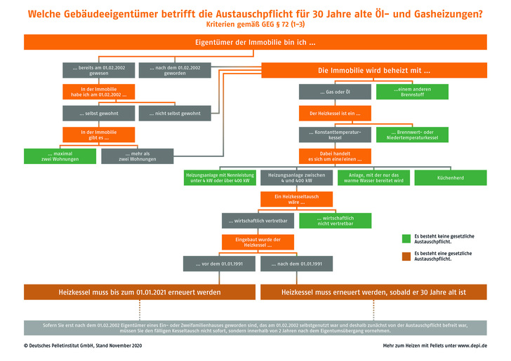 Das GEG billigt weitere Ausnahmen: Wer seit Februar 2002 im Eigenheim mit weniger als drei Wohnungen lebt, der kann auch nach 30 Jahren weiter mit seinem Altkessel heizen. Wer das Haus allerdings erbt oder kauft, der muss innerhalb von zwei Jahren modernisieren. Niedertemperatur- und Brennwer ...