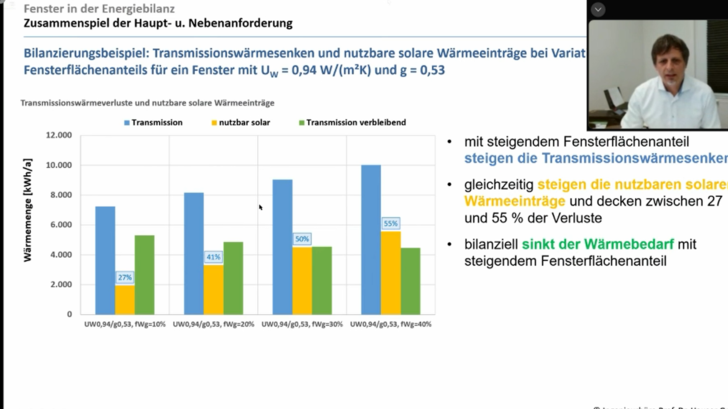 Er erklärte, der HT’-Wert nicht geeignet ist, den Wärmedämmwert von transparenten Bauteilen abzubilden. Einerseits steigen die Transmissionswärmesenken umso mehr, je größer der Fensterflächenanteil in der Außenwandfläche ist, zugleich nehmen aber auch die solaren Gewinne zu, wenn der g-Wert des Fensters dies zulässt. Die heutige „Nebenanforderung“ im Gebäudeenergiegesetz formuliert zulässige Höchstwerte für den spezifischen Transmissionswärmeverlust HT‘, wobei keine solaren Wärmegewinne berücksichtigt werden. Schlimmstenfalls würden Fensterflächen verkleinert, damit sich der HT’-Wert verbessert, aber der Energiebedarf erhöhe sich.