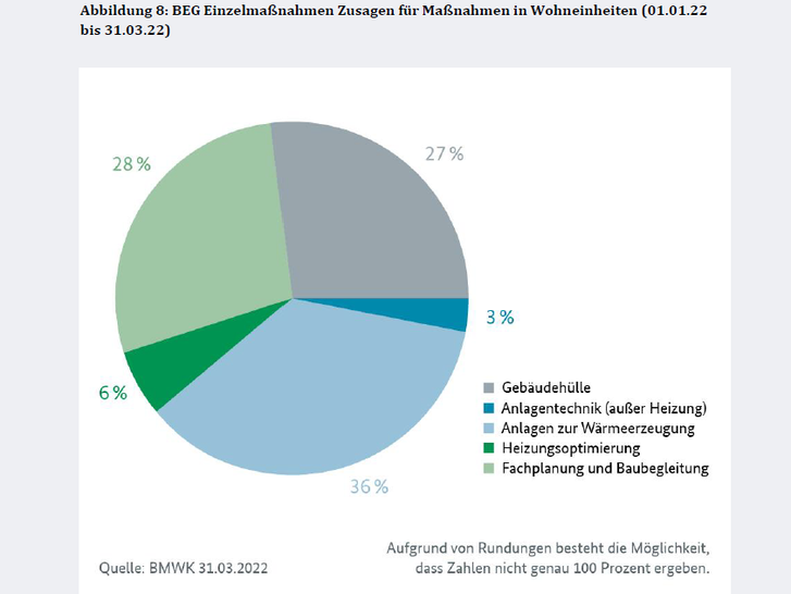 Vom 1. Januar 2021, dem Start der ersten Stufe der BEG bis Ende März 2022 waren es knapp 350.000 Einzelmaßnahmen, gut 150.000 komplette Wohngebäude und knapp 10.000 Nichtwohngebäude. Die Förderung umfasste seit Beginn bei Effizienzgebäuden knapp 520.000 Wohneinheiten, davon knapp 64.000 in der Sanierung.