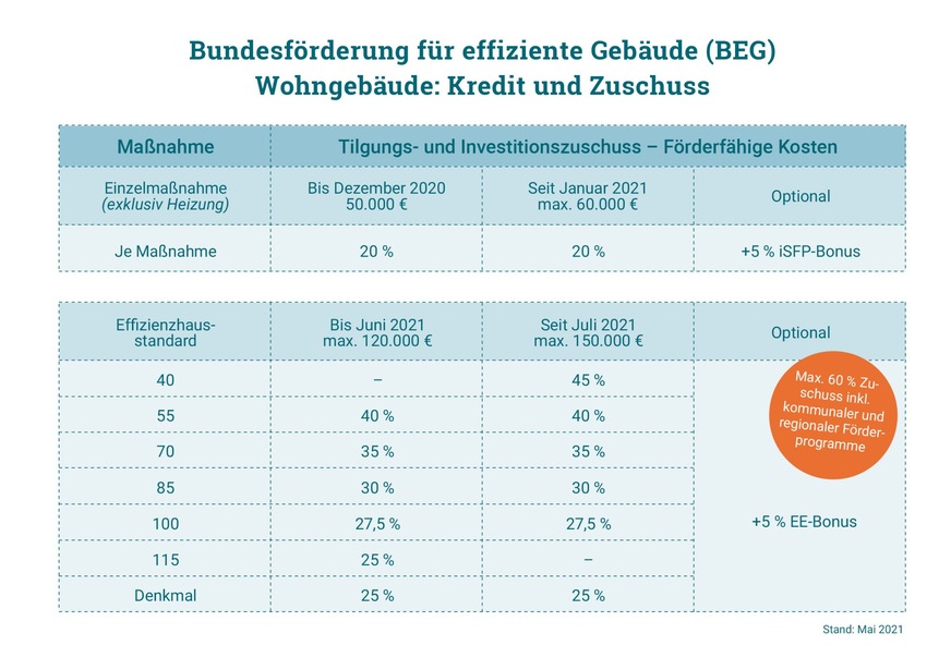 Die verbesserte Förderung ist Teil der zweiten Stufe der Bundesförderung für effiziente Gebäude (BEG), die zum 1. Juli 2021 in Kraft tritt und bereits beantragt werden kann. Neu aufgenommen ist die Effizienzhausklasse 40 mit einer besonders guten Förderung. Ein Bonus von fünf Prozentpunkten ist möglich für alle, die nach der Sanierung überwiegend erneuerbare Energien nutzen. Sie profitieren dann auch von einer Erhöhung der förderfähigen Kosten von 120.000 auf 150.000 Euro. Auch die im Januar gestartete erste Stufe, die Neuordnung der Einzelmaßnahmenförderung, wird nun abschließend geregelt. „Damit ist die Förderung von energetischen Maßnahmen so attraktiv wie noch nie“, Frank Hettler von Zukunft Altbau.