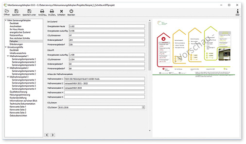 Die Bundesregierung will mit dem Sanierungsfahrplan für Wohngebäude (s. auch S. 10) Schwung in den Markt bringen. Betrachtet werden acht Gebäudekomponenten in ihrer energetischen Qualität – Boden, Wände, Dach, Fenster, Heizung, Wärmeverteilung, Warmwasser und Lüftung. Für den Sanierungsfahrplan können bis zu 5 Maßnahmenpakete geschnürt werden, in jedem Maßnahmenpaket bis zu 5 Gebäudekomponenten energetisch verbessert werden. Der Beratungsempfänger sieht Schritt für Schritt den Einfluss der Maßnahmenpakete auf die energetische Qualität des Gebäudes sowie die wirtschaftlichen Aspekte. Natürlich kann auch eine Sanierung in einem Zug, also ein komplettes Sanierungspaket, dargestellt werden. Der Ergebnisbericht „mein Sanierungsfahrplan“ zeigt auf 7 Seiten den aktuellen Zustand des Gebäudes und die vorgeschlagenen Sanierungsschritte. In einem weiteren Bericht werden die Maßnahmen dargestellt und erläutert. Für die einheitliche Darstellung der Berichte wurde die Entwicklung der Druckapplikation MeinSanierungsfahrplan vom Bundesamt für Wirtschaft und Ausfuhrkontrolle (BAFA) beauftragt und von Envisys entwickelt. Alle Softwareanbieter, die ihren Kunden den Sanierungsfahrplan zur Verfügung stellen wollen, bedienen diese Druckapplikation mit einer eigenen Schnittstelle. Die Druckapplikation ermöglicht die Übertragung aller für den Sanierungsfahrplan erforderlichen Daten in ein Dokument. Komfortabel für den Berater ist eine automatische Übergabe aller dieser Daten aus seiner Energieberatersoftware, wie das z. B. in Evebi von Envisys erfolgt. Das gewohnte Arbeiten mit der Energieberatersoftware sollte daher möglich sein, lediglich einige Zusatzangaben, insbesondere Textangaben und Import von Fotos sind ggf. zu machen. Dafür stehen Textbausteine und Prinzipskizzen zur Verfügung. In der Druckapplikation wird zu allen Eingaben und Ergebnissen jeweils die Druckansicht dargestellt. Zahlenwerte können in der Regel nicht bearbeitet werden, um Übertragungsfehler zu vermeiden. Je kompletter die Schnittstelle von der Energieberatersoftware zur Druckapplikation entwickelt wurde, desto weniger Nachbearbeitungen (von Texten und Bildern) sind erforderlich. Beim Arbeiten mit Evebi können die Daten komplett übergeben und die fertigen Berichte generiert werden, sodass die Druckapplikation gar nicht aufgerufen werden muss. Eine Vollständigkeitsprüfung sorgt dafür, dass alle notwendigen Angaben enthalten sind, wenn der Sanierungsfahrplan gedruckt wird. Zum Thema Mein Sanierungsfahrplan bietet Envisys bei der dena anerkannte Seminare an.