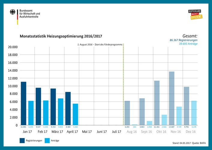 Doch die Förderzuschüsse werden nur sehr spärlich abgerufen. Bis 2020 sollen mit dem Förderprogramm jährlich bis zu 2 Mio. Pumpen ausgetauscht und 200.000 hydraulische Abgleiche durchgeführt werden. Das entspricht durchschnittlich etwa 160.000 Maßnahmen pro Monat. In den ersten neun Monaten nach dem Programmstart sind jedoch erst 86.367 Registrierungen und 39.693 Anträge eingegangen. Den höchsten Monatswert hat das BAFA für März 2017 mit 6825 Anträgen gemeldet, im Mittel von Januar bis April 2017 waren es 6205.