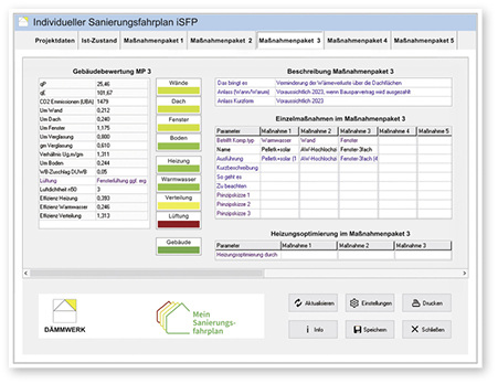 Das Jahres-Update Dämmwerk 2018 stellt unter anderem den neuen Sanierungsfahrplan für Wohngebäude (iSFP) zur Verfügung, der im Auftrag des BMWi unter Federführung der Deutschen Energie-Agentur (dena) entwickelt wurde. Neu an der iSFP-Methodik sind ein farblich abgestuftes Bewertungssystem mit viel Raum für ehrgeizige Einsparziele und logisch aufeinander aufbauende Sanierungsschritte. Das Durchführen der Maßnahmen kann bei Bedarf über einen längeren Zeitraum gestreckt werden. Der iSFP umfasst die standardisierten Berichtsunterlagen „Mein Sanierungsfahrplan“ und „Umsetzungshilfe für meine Maßnahmen“. Die bebilderten Berichte beschränken sich auf das Wesentliche. Sie werden mithilfe einer speziellen Druckapplikation ausgegeben. Neben der Implementierung des individuellen Sanierungsfahrplans, die ausführlichen Praxistests unterzogen wird, bietet Dämmwerk 2018 aktualisierte Baustoffdaten sowie Erweiterungen und Zusatzfunktionen, wie beispielsweise die neue, verbesserte Raumskizze für den Schallschutz nach DIN 4109:2016, eine fünfte Modernisierungsvariante für die Energieberatung und eine neue Druckapplikation für den dibt-Energieausweis mit diversen Parameter-Modifikationen. Eine kostenlose Testversion und weitere Informationen erhalten Sie unter