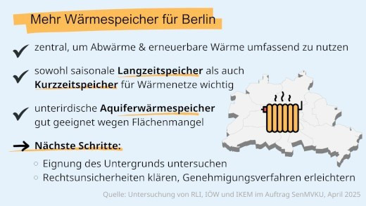 Für Berlin seien die saisonalen Aquiferspeicher besonders geeignet. Das sind offene Systeme zur Speicherung und Rückgewinnung von Wärme in hydraulisch abgeschlossenen Grundwasserschichten. Saisonale Wärmespeicher speichern überschüssige Wärme im Sommer und stellen sie im Winter zur Verfügung.