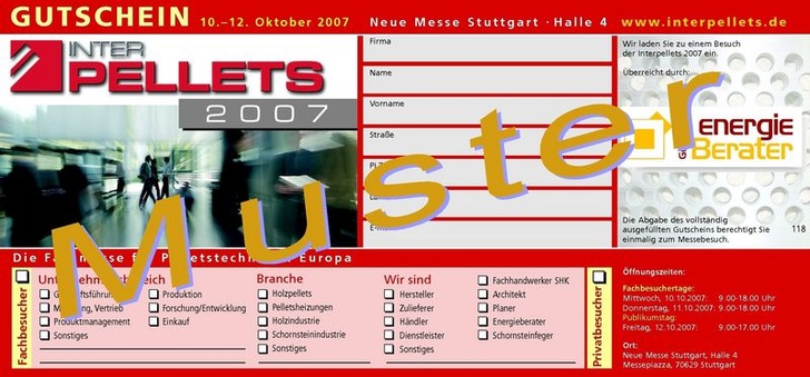 GEB-Leser erhalten mit ihrem Heft 09-2007 am 13. September einen Eintrittsgutschein zur Interpellets vom 10. bis 12. Oktober auf dem neuen Messegelände in Stuttgart. Rund 150 Aussteller und 6000 Besucher erwartet der Veranstalter Solar Promotion zu der Fachmesse für Pelletstechnik, die die gesamte Wertschöpfungskette für Energiepellets abdeckt. Eine hochkarätige Informations- und Diskussionsplattform zum Thema bietet im Vorfeld vom 9. bis 10. Oktober das 7. Industrieforum Pellets im Internationalen Congresscenter Stuttgart (ICS).
