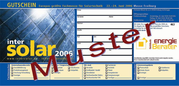 Die Intersolar in Freiburg ist für Solarexperten inzwischen eine Pflichtveranstaltung. Unser Service für GEB-Leser: Ein Gutschein, mit dem Sie während der Messe vom 22. bis 24. Juni 2006 an der Kasse Ihre kostenlose Tageskarte erhalten.