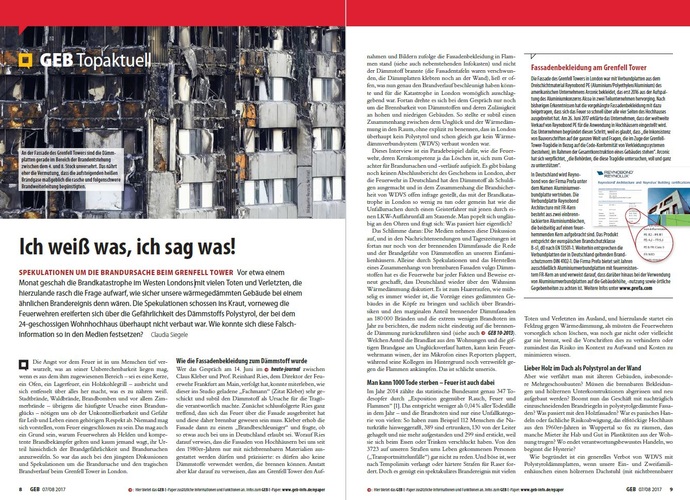 Nach dem Hochhausbrand des „Grenfell Tower“ mit vielen Toten und Verletzten wurde hierzulande rasch die Frage aufgeworfen, wie sicher unsere wärmegedämmten Gebäude bei einem ähnlichen Brandereignis wären. Spekulationen schossen ins Kraut. Ein Topaktuell in GEB 07/08-2017 arbeitet auf, wie sich Falschinformation in den Medien festgesetzt haben und bis heute ihre Wirkung entfalten.