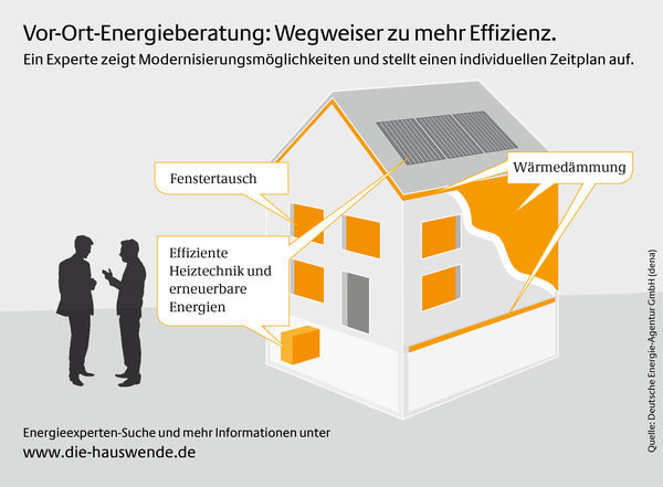 Die dena rät Hausbesitzern: Ein Termin mit dem Energieberater ist der beste Einstieg, um aus dem eigenen Zuhause ein energiesparendes Effizienzhaus zu machen. Damit die gewünschte Energie- und Kosteneinsparung auch tatsächlich erreicht wird, seien eine qualifizierte Energieberatung, eine fundierte Diagnose und eine gute Planung unbedingt erforderlich. Für die Suche nach Fachleuten verweist die dena auf die