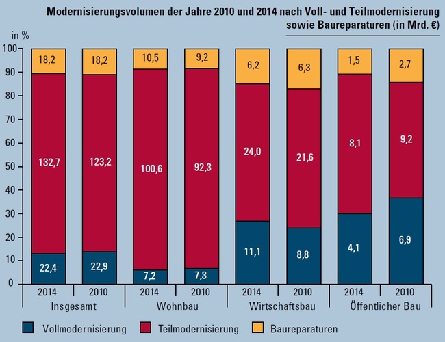 94 % aller Modernisierungen betrafen der Studie zufolge einzelne Maßnahmen wie den Austausch von Fenstern, Türen oder Heizungen. Stark rückläufig waren große Einzelmaßnahmen ab 10.000 Euro. Dazu zählt insbesondere die Gebäudedämmung. Einen besonders starken Rückgang (–33 %) gab es bei der energetischen Komplettmodernisierung. Die Investitionen sanken von 2,9 Mrd. Euro im Jahr 2010 auf 1,9 Mrd. Euro im Jahr 2014.