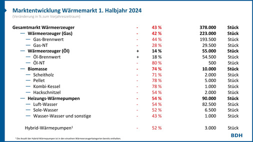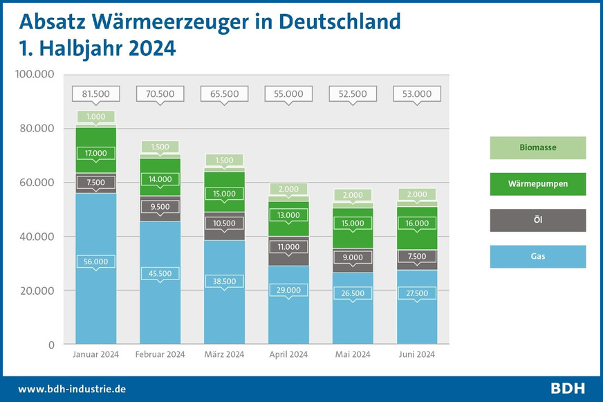 Von Januar bis Mai 2024 lag der Gesamtabsatz bei einem Minus von 35 %. Ein weiterer Absturz war jedoch abzusehen, weil die Rekordwerte 2023 insbesondere mit einem steilen Absatzhochlauf in der Jahresmitte mit einem Hochpunkt bei Gas- und Öl-Heizungen im 3. Quartal einherging. Beispielsweise wurden im Juni 2023 rund 84 000 Gas-Heizungen (Juni 2024: 27 500), etwa 10 000 Öl-Heizungen (Juni 2024: 7000) und ca. 42 500 Wärmepumpen (Juni 2024: 16 000) ausgeliefert.