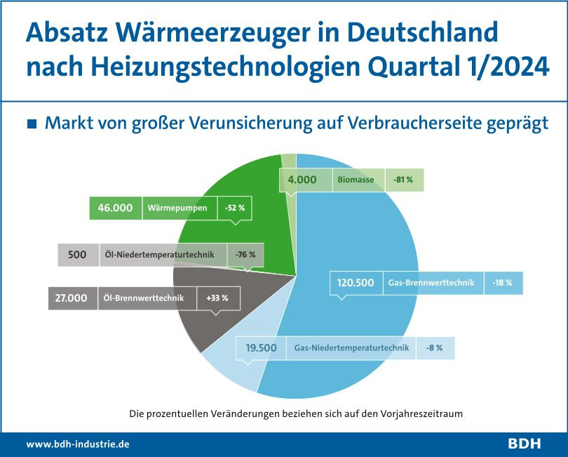 Im ersten Quartal ist der Absatz von Wärmeerzeugern in Deutschland gegenüber dem Vorjahreszeitraum um 29 Prozent zurückgegangen. Insbesondere Biomasseheizungen und Wärmepumpen sind betroffen. Das geht aus den Zahlen des Bundesverbands der Deutschen Heizungsindustrie (BDH) vor. „Der Markt für Heizungsmodernisierung ist aktuell geprägt von einer tiefen Verunsicherung der Verbraucher“, erklärt Hauptgeschäftsführer Markus Staudt die Marktsituation. Vor allem habe die langwierige und öffentliche politische Debatte um den gesetzlichen Rahmen und die Förderung in der Gebäudewärme dafür gesorgt, dass bei den Menschen Vertrauen verloren gegangen sei. Zudem sei noch zu wenig bekannt, welche technischen Möglichkeiten das Gebäudeenergiegesetz biete und wie Heizungen gefördert würden. Mit dem rückläufigen Markt für Wärmepumpen rückt das Ziel der Bundesregierung von 500.000 Wärmepumpen in diesem Jahr in weite Ferne. Der BDH schätzt, dass im laufenden Jahr weniger als 200.000 Wärmepumpen abgesetzt werden.