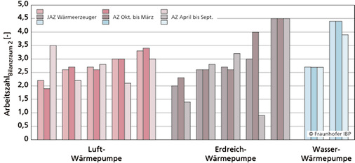 Der Vergleich mit den Ergebnissen aus den Feld-Untersuchungen des Fraunhofer ISE [2] zeigt, dass die im Förderprogramm Effizienzhaus Plus gemessenen mittleren praktischen Jahresarbeitszahlen geringfügig niedriger ausfallen, aber grundsätzlich eine vergleichbare Tendenz zeigen.