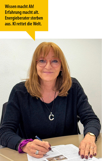 Ich kann Sie beruhigen – das Bild links zeigt keinen grinsenden Avatar, sondern (noch) eine echte Redakteurin aus Fleisch und Blut beim Heftschluss dieser Ausgabe. Die auch diesmal wieder viel Fachwissen für Energieberater enthält, sauber von der Fachredaktion aussortiert: das Gute ins Heftchen, das Schlechte ins Kröpfchen. Die KI hat dabei natürlich heimlich zugesehen und eifrig alles notiert – sorry: gespeichert! –, um beim nächsten User-Prompt ihr gestohlenes Wissen stolz, aber eben gänzlich unreflektiert wieder auszuspucken. Und das ist dann die gesalbte goldkalbige künstliche Intelligenz …