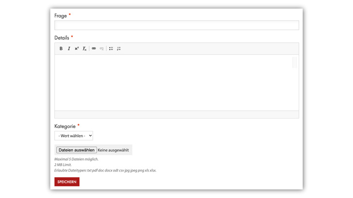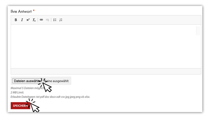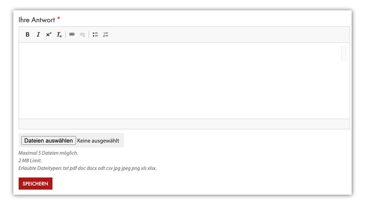 In beiden Fällen finden Sie einen Text-Editor vor, in welchen Sie Ihre Antwort eingeben können. Ihnen stehen dabei Formatierungen zur Verfügung. Bitte achten Sie dabei auf eine korrekte Rechtschreibung und einen freundlichen Umgangston. Sie können außerdem verschiedene Dateien hochladen. Klicken Sie am Ende auf "SPEICHERN".