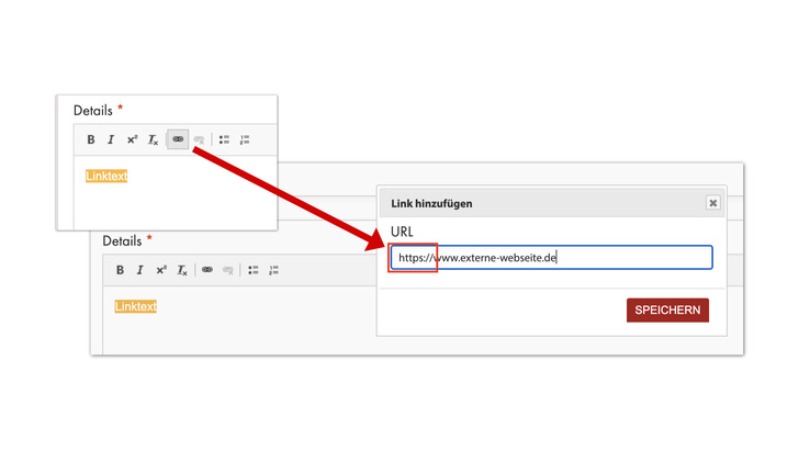 Im Textfeld können Sie auch einen Link hinzufügen. Sie können entweder die komplette Linkadresse in den Texteditor eintragen oder einen Text mit einem Link versehen. Bitte achten Sie darauf, das Protokoll (http bzw. https) dabei mit anzugeben, da der Link sonst nicht funktioniert.