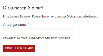 Wenn Sie das erste Mal eine Frage stellen oder einen Kommentar verfassen möchten, müssen Sie sich einen Anzeigenamen geben. Dieser muss zwischen 8 und 32 Zeichen lang sein.