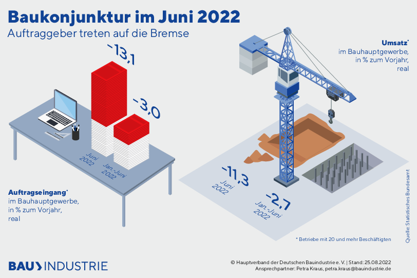 Das Statistische Bundesamt hat für den Monat Juni 2022 einen preisbereinigten Rückgang des Auftragseingangs im Bauhauptgewerbe (Baubetriebe mit 20 und mehr Beschäftigten) im Vergleich zum Vorjahresmonat von 13,1 % (kalenderbereinigt: − 11,2 %) und im Vergleich zum Vormonat Mai 2022 von 5,5 % (saison-, kalender- und preisbereinigt) gemeldet. Für das gesamte erste Halbjahr 2022 wird mittlerweile ein reales Minus von 3,0 % ausgewiesen (kalenderbereinigt: − 3,5 %).