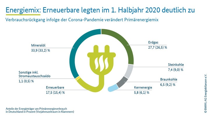 Der Rückgang in den ersten sechs Monaten hat alle wichtigen fossilen Energieträger betroffen. Knapp zwei Drittel der Abnahme entfielen auf Braun- und Steinkohle, weshalb die AG Energiebilanzen für das erste Halbjahr ebenfalls mit einem deutlichen Rückgang der energiebedingten CO2-Emissionen rechnet. Für das gesamte Jahr 2020 könnte er zwischen zehn und 17 Prozent liegen. Die erneuerbaren Energien dagegen steigerten ihren Beitrag. Solarenergie und Windkraft verzeichneten aufgrund günstiger Witterung ein Plus von zehn Prozent. Wasserkraftwerke lieferten ein Prozent mehr Strom. Nur die Biomasse büßte ein Prozent Anteil ein. Insgesamt stemmten die erneuerbaren Energien in den ersten sechs Monaten 17,5 Prozent des Primärenergieverbrauchs. 2,1 Prozent mehr als im Vorjahreszeitraum. Mineralöl kam auf 33,9 Prozent (plus 0,7 Prozent), Erdgas auf 27,7 Prozent (plus 1,2 Prozent). Der Beitrag von Steinkohle sank um 1,6 auf 7,4 Prozent, der Anteil von Braunkohle um 2,7 auf 6,5 Prozent. Die Kernenergie verringerte ihren Anteil um 0,3 Prozent auf 5,8 Prozent. Quelle: BMWi / jb
