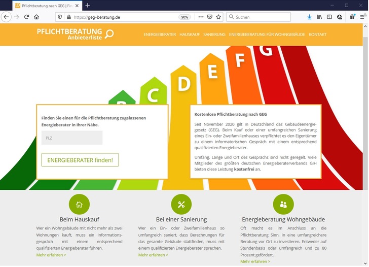 Das Gebäudeenergiegesetzt (GEG) sieht seit dem 1. November 2020 neue Pflichten für Hausbesitzer vor: Wer ein Ein- oder Zweifamilienhaus kauft oder umfangreich saniert, muss einen Energieberater hinzuziehen. Ein Portal des Energieberaterverbands GIH weist den Weg zu kostenlosen Beratungsangeboten.