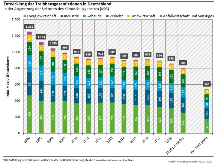 Im Vergleich zu 1990 sanken die Emissionen in Deutschland um 35,7 %. Bis 2030 will Deutschland seine Emissionen laut Klimaschutzgesetz um mindestens 55 % mindern. Klimaschutzziel für 2020 ist eine Minderung um 40 %.