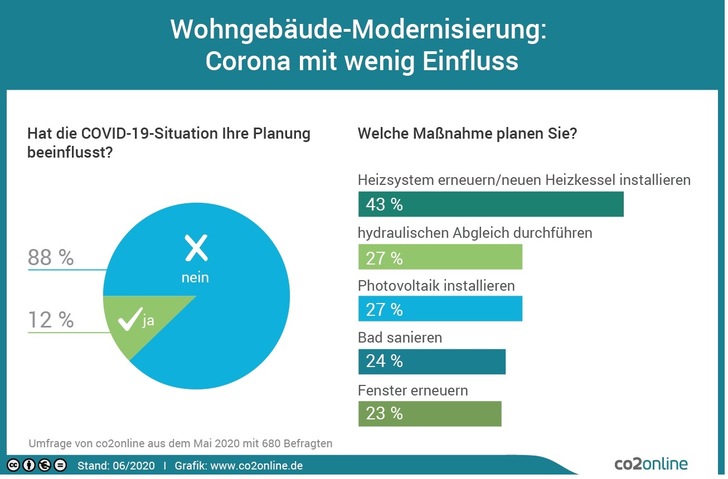 Die Corona-Krise hat nur wenig Einfluss auf das Modernisieren von Wohngebäuden. Das geht aus einer Verbraucher-Umfrage der gemeinnützigen Beratungsgesellschaft co2online hervor. Rund 88 % der Befragten gaben an, dass die Coronavirus-Krise ihre Entscheidung für eine Sanierung nicht beeinflusst hat.