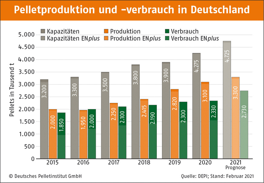 Als Land mit der europaweit höchsten Sägewerksdichte und dem damit verbundenen Anfall von Sägeresthölzern gehört Deutschland bei der Pelletsproduktion international zu den führenden Nationen. Auch im vergangenen Jahr waren mit 97,4 Prozent fast alle Presslinge in der Premiumklasse ENplus A1 hergestellt worden. Als Rohstoff kamen mit 84,9 Prozent hauptsächlich Holzspäne aus Sägewerken zum Einsatz, ergänzt um nicht sägefähiges Rundholz. Dessen Anteil war schadholzbedingt im vergangenen höher als sonst. Für das laufende Jahr rechnet der DEPV mit einem moderaten Anstieg der Pelletsproduktion auf 3,3 Millionen Tonnen.