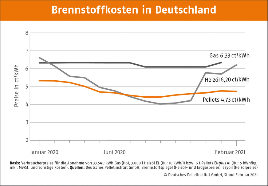 Der Preis für Holzpellets hat sich auch im vergangenen Jahr als stabil und günstig erwiesen. Gegenüber 2019 ist er sogar gesunken. Im Jahresdurchschnitt zahlten Heizungsbetreiber laut DEPV für eine Tonne Pellets 237,28 Euro, was 4,75 Cent pro Kilowattstunde. Das waren 5,55 Prozent weniger als 2019. Heizöl war in Deutschland 2020 im Durchschnitt 4,8 Prozent teurer, Gas durchschnittlich 31,2 Prozent teurer. Quelle: DEPV / jb