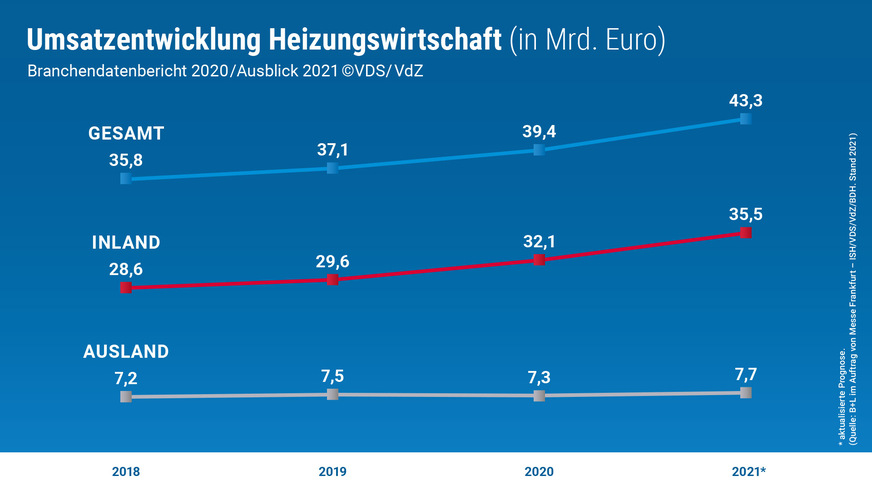 Die Haus- und Gebäudetechnikbranche kann sich freuen: Seit 2018 kann sie ihre Umsätze kontinuierlich steigern. Zu diesem Ergebnis kommt der von dem Bundesverband der Deutschen Heizungsindustrie (BDH), der Vereinigung Deutsche Sanitärwirtschaft (VDS) und der Wirtschaftsvereinigung Gebäude und Energie (VdZ) sowie der Messe Frankfurt in Auftrag gegebene aktuelle Bericht zu den Branchendaten Haus- und Gebäudetechnik 2020. Demnach waren die Umsätze im vergangenen Jahr um 5,7 Prozent auf 64,4 Milliarden Euro. rd. Euro gestiegen. Für dieses Jahr erwartet die Branche 70 Milliarden Euro. „Der Grund für das erneut anhaltend starke Wachstum liegt maßgeblich in dem durch das Klimapaket 2020 angeschobenen Sanierungsboom im privaten Wohnbau sowie in den internationalen Bestrebungen zum Klimaschutz“, schreiben die Verbände in einer gemeinsamen Presseinformation. Allerdings haben sich die Umsätze in den europäischen Märkten unterschiedlich entwickelt. Während sie in Deutschland stark gestiegen sind, sind sie Frankreich, Großbritannien und Italien zurückgegangen.
