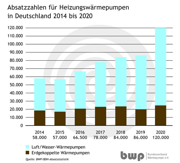 Laut der Absatzstatistik fiel im vergangenen Jahr das Wachstum bei Luft-Wasser-Wärmepumpen besonders hoch aus. 95.500 Geräte und damit 44 Prozent mehr als im Vorjahr wurden abgesetzt. Bei 56.500 Anlagen handelte es sich um Monoblock-Geräte (plus 61 Prozent). Hinzu kamen 39.000 Split-Geräte (plus 26 Prozent). Sole-Wasser-Wärmepumpen legten um 18 Prozent zu. 20.500 erdgekoppelte Anlagen wurden 2020 verkauft. Bei Grundwasser-Wärmepumpen und sonstigen Wärmequellen liegt das Wachstum mit 4.000 installierten Anlagen bei 60 Prozent. Luft-Wasser-Systeme konnten ihren Marktanteil von 72 auf 79,4 Prozent vergrößern. Bei reinen Warmwasser-Wärmepumpen stieg die Zahl der installierten Geräte um 24 Prozent auf 20.500 Geräte. Die Gesamtzahl aller installierten Wärmepumpen lag damit bei 140.500. Mit insgesamt knapp über einer Million installierter Heizungswärmepumpen bei 21 Millionen Heizungssystemen ist der Weg zur Klimaneutralität im deutschen Gebäudesektor jedoch noch weit. Der BWP zitiert aktuelle Klimastudien, denen zufolge die zweite Million Wärmepumpen bereits im kommenden Jahr installiert sein müsste, um die Klimaziele zu erreichen.