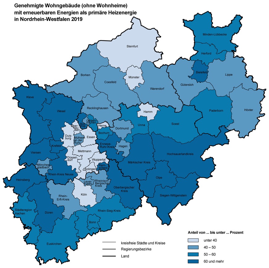 In Nordrhein-Westfalen soll rund jedes zweite (50,6 %) der 18 334 im Jahr 2019 genehmigten Wohnhäuser (ohne Wohnheime) überwiegend oder ausschließlich mit erneuerbaren Energien beheizt werden.