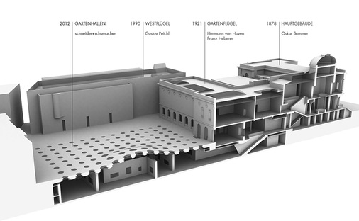 In die hellen unterirdischen Gartenhallen gelangt man vom Haupteingang des historischen Museumsbaus her über eine großzügige, einläufige Terrazzotreppe, die sich nach unten hin aufweitet und das Foyer im historischen Gartenflügel mit den neuen Gartenhallen verbindet (Abb. 2 ). Obwohl man dabei Stufe um Stufe weiter hinabsteigt, hat man zu keinem Zeitpunkt das Gefühl, man begebe sich in ein wenig attraktives Kellergeschoss des Museums, auch wenn hier das Tageslicht ausschließlich von oben hereindringt. Ganz im Gegenteil – überraschend und angenehm hell, luftig und hochwertig präsentiert sich dieser 48 x 55 m große Ausstellungsraum, dessen freigeformte, den ganzen Raum überspannende Deckenschale sich von sechs Metern Raumhöhe am Rand auf bis zu 8,2 m im Zentrum aufwölbt (Abb. 5, 8 )