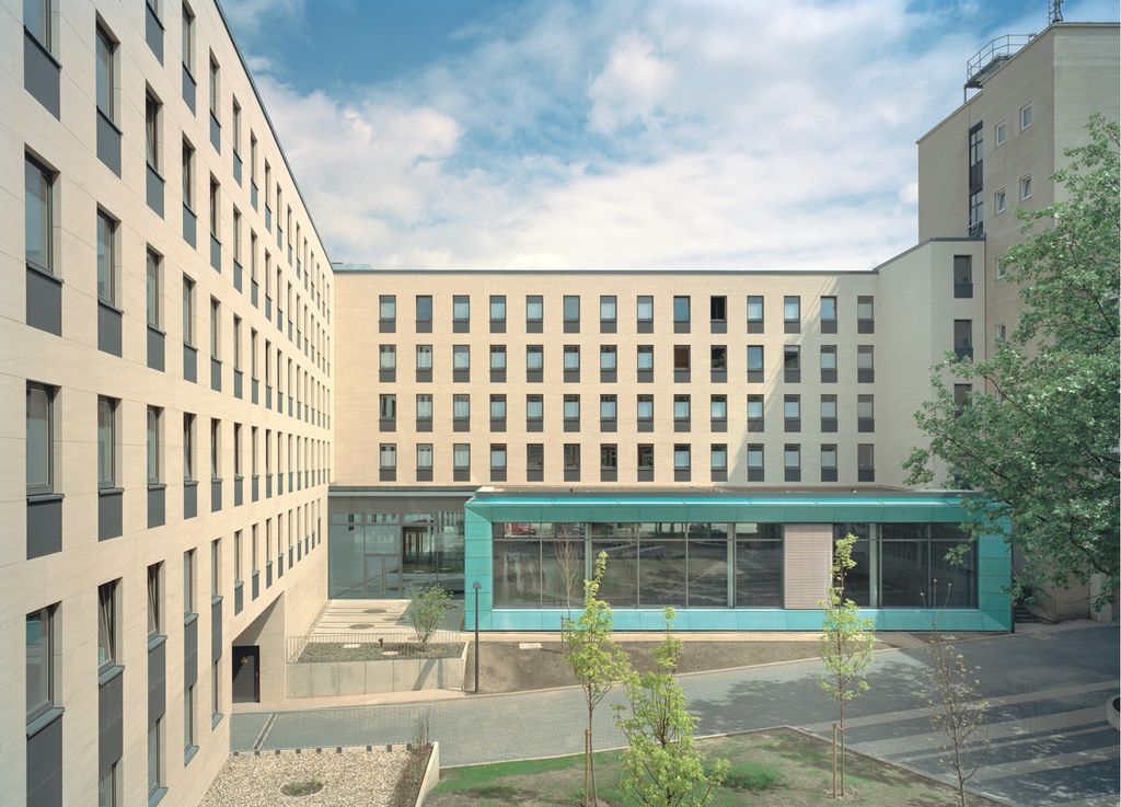 Das Grundstück liegt zentral in einem baulichen Umfeld geprägt durch die Stadtbibliothek und Gebäude der 1950er-Jahre. Der Neubau ergänzt den Gebäudebestand an der Hildesheimer Straße um einen sechsgeschossigen Winkel mit Zellenbüros und einen eingeschossigen Kubus (Abb. 1) mit dem Saal der Regionsversammlung. Dieser scheint im Erdgeschoss durch den Winkel gesteckt und reicht bis unmittelbar an den öffentlichen Fußweg. Mit großer Transparenz der Fassade entsteht das „Fenster zur Region”. Dem Betrachter eröffnet sich dabei der Blick von der Straße durch das ganze Gebäude bis in den Innenhof (Abb. 2). Aus Kostengründen wurde auf eine Unterkellerung und eine Tiefgarage verzichtet. Trotzdem sind die Vorflächen und der Innenhof frei von Parkplätzen. Der ruhende Verkehr mit über 140 Stellplätzen konnte im rückwärtigen Bereich des Grundstücks gebündelt werden. Von der Saalwand begleitet betritt der Besucher das Foyer, den zentralen Dreh- und Angelpunkt aller Funktionen im großzügigen Zwischenraum von Saalbau und Büroriegel. Von hier aus gelangt man zur Rechten über das zentrale Treppenhaus im Schnittpunkt der Gebäudeflügel zu den Fachbereichen in den Obergeschossen. Oder man erreicht zur Linken den unmittelbar angrenzenden Saalbau, der dreifach teilbar Platz für bis zu 540 Personen bietet.