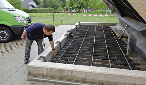 Die Gemeinde Murg entschied sich aus ökologischen und ökonomischen Gründen, im Grundlastbetrieb auf Holzhackschnitzel umzustellen. Sie bezieht den nachwachsenden Brennstoff von einem einheimischen Landwirt, der in ca. 500 m Entfernung von der Heizzentrale seinen Betrieb hat. Er kippt die Hackschnitzel als Schüttgut mit etwa 200 kg/m³ direkt in den Speicher. Unter der Abdeckung, die sich über die gesamte Länge und Breite des Behälters erstreckt, ist in der rechteckigen Öffnung ein Rüttelsieb eingebaut. Während des Befüllens wird es elektrisch in Bewegung versetzt, um Hohlräume und Schüttkegel weitgehend zu vermeiden. Ziel ist nicht nur, das Volumen des Behälters optimal auszunutzen, sondern auch die störungsfreie Entnahme am Speicherboden zu ermöglichen. Der Inhalt des Hackschnitzellagers von 150 m 3 entspricht 30 t Füllgewicht bzw. 12 000 l Heizöläquivalent. Die üblichen, oben offenen Transportcontainer fassen 40 m 3 bzw. 8 t. Der Lieferant kann also nachfüllen, sobald ein Drittel des Vorrats aufgebraucht ist. Er übernimmt auch das Abholen der Asche, die er auf seinen Äckern als Dünger ausbringen kann.