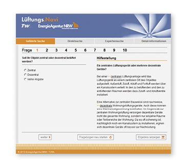 Worauf kommt es bei einer Lüftungsanlage an, welche Anlage ist für die individuellen Bedürfnisse und Anforderungen der Räumlichkeiten die Richtige? Mit dem „Lüftungs.Navi“ wollen die Energieagentur NRW und das Europäische Testzentrum für Wohnungslüftungsgeräte e. V. (TZWL) diese Fragen beantworten.Ein Fragenkatalog ermittelt technische Anforderungen an das Lüftungsgerät und die Beschaffenheit der zu belüftenden Räume. Erläuterungen zu jeder Frage erleichtern technischen Laien die Nutzung des Tools. Nach Abschluss des Tests werden aus einem Pool mit rund 140 Geräten von mehr als 45 Herstellern die passenden Lüftungsgeräte angezeigt. Experten können den Fragebogen umgehen und in einer Direktsuche nach konkreten Geräten und Herstellern schauen oder Geräte auf Basis technischer Vorgaben suchen.