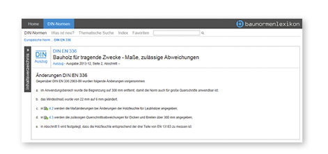 Wer über wichtige Änderungen in rund 1500 DIN-Baunormen auf dem Laufenden sein will, dem bietet Baunormenlexikon einen kostenlosen Online-Service. Monatlich werden auf der Homepage Normen aufgelistet, die gerade neu herausgegeben oder geändert wurden. Per Mausklick gelangt man zur Kurzdarstellung der Änderungen gegenüber der bisherigen Norm-Ausgabe. Für den Zugriff ist eine kostenlose Anmeldung erforderlich. Die Informationen über geänderte DIN-Normen werden zudem als monatlicher E-Mail-Newsletter angeboten. Wer die Originaltexte der Baunormen benötigt, findet auf der Website Angebote für verschiedene Online-Pakete.