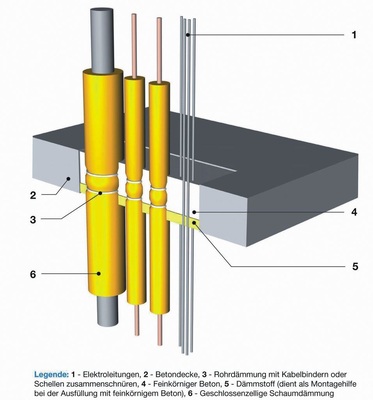 Die Durchführung von Installationen durch eine Geschossdecke zählt zu den typischen Fehlerquellen beim Ausführen der luftdichten Ebene. Eine praktische Lösung bietet der Fachverband Luftdichtheit im Bauwesen e.V. (FLiB) als Prinzipskizze zum Herunterladen. Zunächst stopft man von unten her sämtliche Lücken zwischen den Kabeln oder zwischen Rohren und dem Rand der Öffnung z.B. mit Dämmwolle aus und verspachtelt diese. Dann wird der gesamte Deckendurchbruch von oben mit feinkörnigem Beton oder Gips lückenlos ausgegossen. http://www.directnewsroom.de/servlets/LoadBinaryServlet/2207190/Durchbruch.jpg
