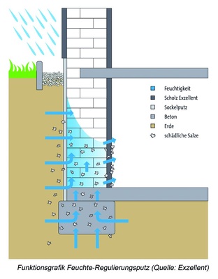 Seit mehr als zehn Jahren bewähren sich Exzellent Feuchte-Regulierputze (FRP) als wirkungsvoller Dauerschutz für nasse Mauern und feuchte Wände im Innen- und Außenbereich. Sie verfügen aufgrund spezieller, natürlicher Wirkstoffe über eine besondere Struktur, welche die Feuchtigkeit aus dem Mauerwerk in Form von Wasserdampf an die Raumluft abgibt. Bei diesem Diffusionsvorgang mit hoher Austrocknungsleistung (bis zu 2100 g/m 2 pro Tag) werden auch die Salze an die Putzoberfläche transportiert. Die Poren im Gefüge bleiben offen und die Putzoberfläche trocken - allein das an der Wandoberfläche zurückgebliebene Salzkonzentrat muss immer mal wieder entfernt werden. Dieses Prinzip birgt gegenüber den sich allmählich mit Salzen anreichernden Sanierputzen den Vorteil, dass der FRP auf Dauer über die ganze Auftragsdicke erhalten und funktionsfähig bleibt. Angenehmer Neben-effekt: Bei Verarbeitung des Exzellent-FRP können aufgrund der niedrigen Rohdichte anstelle des üblichen Lambdawertes für Normalputze (0,87 W/m 2 K) 0,40 W/m 2 K als Rechenwert angesetzt werden. In Abhängigkeit von der Putzdicke und dem Auftrag (innen oder außen) ergeben sich somit rechnerisch bei einem 38 cm dicken historischen Vollziegelmauerwerk pro Quadratmeter Wandfläche sechs bis 12 % Energieersparnis. Während sich beim Ziegelmauerwerk mit normalem Kalkzementputz in kalten Winternächten ein Tauwasserausfall nicht vermeiden lässt, bleibt die gleiche Wandkonstruktion tauwasserfrei, wenn sie 20 mm dick mit Exzellent-FRP verputzt wird.
