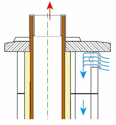 Jede Feuerstätte benötigt zur Verbrennung ausreichend Sauerstoff. Dieser wurde bisher entweder der Raumluft entnommen, oder der Heizungskessel stand in einem separaten Raum mit Fenster- oder spezieller Zuluftöffnung. Da die EnEV eine dichte Gebäudehülle fordert, ist das Nachströmen von Verbrennungsluft über Öffnungen in der Gebäudehülle nicht mehr möglich. Bei modernen Brennwertkesseln wird die Verbrennungsluft deshalb in der Regel konzentrisch über einen Ring- spalt zwischen der Außenseite des Schamottrohrs und der Innenwand des Kaminmantelsteins zur Feuerstätte geführt. Bei Festbrennstoffgeräten müsste die Rohr- säule aufgrund der hohen Abgastemperaturen gedämmt werden, um eine starke Aufheizung der Zuluft zu verhindern. Aber auch bei einer gedämmten Rohrsäule kann man sich nicht sicher sein, dass die heißen Abgase des Kamin- oder Kachelofens die Zuluft nicht soweit erwärmen, dass sie nach oben steigt und somit der Verbrennungsvorgang aufgrund unzureichender Luftversorgung gestört wäre. Eine Lösung dieses Problems ist der hinterlüftete KLB-Isolierschornstein mit parallel geführtem Luftschacht. In dem einen Zug werden die Abgase sicher nach außen geführt, die Zuluft strömt hingegen ohne nennenswerte Erwärmung über den separat angeformten Zuluftschacht zur Feuerstätte.