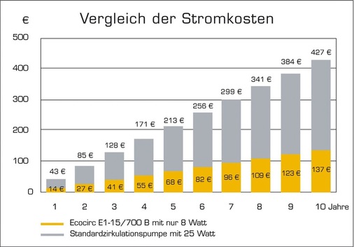 Nur acht Watt benötigt die neue Trinkwasser-Umwälzpumpe Ecocirc E1 von Laing, was gegenüber marktüblichen 25-Watt-Standardpumpen einer Effizienzsteigerung von mehr als 68 Prozent gleichkommt. Und das bei vergleichbarer hydraulischer Leistung! Zurückzuführen ist diese Einsparung auf die ECM-Technologie, die Laing fortan nicht nur für Heizungspumpen sondern auch für Trinkwasser-Zirkulationspumpen anbietet. Das am Kugelrotor erforderliche Magnetfeld muss bei dieser Technologie nicht erst verlustreich erzeugt werden, sondern ist von vornherein permanent vorhanden. Das spart natürlich erheblich Energie ein. Auch das Anlaufmoment ist höher, somit ist das Blockieren der Pumpe so gut wie ausgeschlossen. Die genügsame Ecocirc E1 eignet sich je nach Auslegung für Anlagen in Ein- und Mehrfamilienhäusern. Die Modelle sind wahlweise mit integriertem Rückschlag- und Absperrventil sowie mit elektronischem Regelthermostat (20°C bis 70°C) lieferbar. Kleines Rechenexempel am Schluss: Bei zehn Jahren Dauerbetrieb fallen bei einer 25-Watt-Standardpumpe rund 427 Euro Stromkosten an. Die sparsame 8-Watt-Ecocirc E1-Pumpe kommt im selben Zeitraum auf nur 137 Euro Stromkosten – binnen zehn Jahren häuft sich somit bei einem derzeitigen Durchschnitts-Strompreis von 19,49 ct/kWh (exklusive garantierter Preissteigerung) eine Ersparnis von rund 290 Euro an. Nicht zu vergessen die CO&sub2;-Reduzierung. Eigentlich ein klarer Fall zum Handeln.