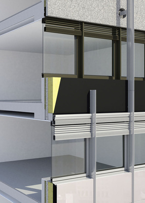 Die Systemkonstruktion deckt neben den Fensterflächen (Warmbereiche) auch die opaken Gebäudeflächen (Kaltbereiche) ab, für die der Modulbaukasten systemintegrierte Kaltfassaden-Komponenten bereithält. In diesen hinterlüfteten Kaltbereichen sind die Dämmstoffdicken variabel – je nach Wunsch lassen sich EnEV- bis Passivhaus-Standard erfüllen. Die opaken Fassadenbereiche können mit Photovoltaikmodulen, Blechkassetten, Glaselementen oder auch mit Naturstein bekleidet werden. Darüber hinaus ist die Kopplung an die Standard Pfosten-Riegel-Systeme Schüco FW 50+ und FW 60+ in allen verfügbaren Dämmvarianten bis zur Passivhausqualität ohne Weiteres möglich.