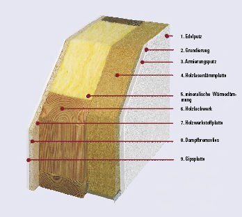 Die Basis des Fertighauses in Holzbauweise war von Beginn an eine mehrschichtig aufgebaute, sehr gut dämmende Außenwand, aus der in diesem Jahr die neue Außenwand ÖvoNatur hervorging, welche seit April 2006 alle Weber-Häuser umschließt. Mit einem Wärmedurchgangskoeffizienten von U = 0,159 W/m 2 K lassen sich mit dieser Wandkonstruktion die Vorgaben der EnEV spielend einhalten. Das Grundgerüst der überwiegend aus ökologischen Baustoffen zusammengesetzten Außenwand besteht aus einem Holzfachwerk (Balkenmaß: 70 x 165 Millimeter), das zur Außenseite hin mit einer zehn Zentimeter dicken Holzfaserdämmplatte beplankt ist. Zur Innenseite unterstützt eine 16 mm dicke Holzwerkstoffplatte die Gebäudeaussteifung und ermöglicht zugleich die dübelfreie Montage schwerer Hängeschränke. Zwischen der Holzwerkstoffplatte und dem innenseitigen Wandabschluss, einer Gipsplatte, puffert ein Dampfbremsvlies den Feuchtigkeitstransport durch die Holzwand ab. In dem gesamten, 30 cm dicken Wandquerschnitt sucht man vergeblich nach Hartschaumplatten aus Polystyrol, stattdessen ist der Zwischenraum des Holzfachwerks mit einem mineralischen Wärmedämmstoff ausgefüllt. ÖvoNatur sorgt nicht nur sommers wie winters für ein angenehmes Raumklima, sondern schafft es auch, mit einem Schallschutzwert von 50 dB den Straßenlärm wirkungsvoll auszusperren.